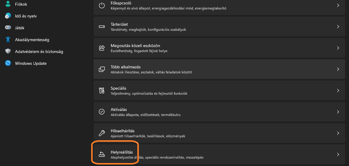 Hibaelhárítás menüelemet kell kiválasztani rákattintással.