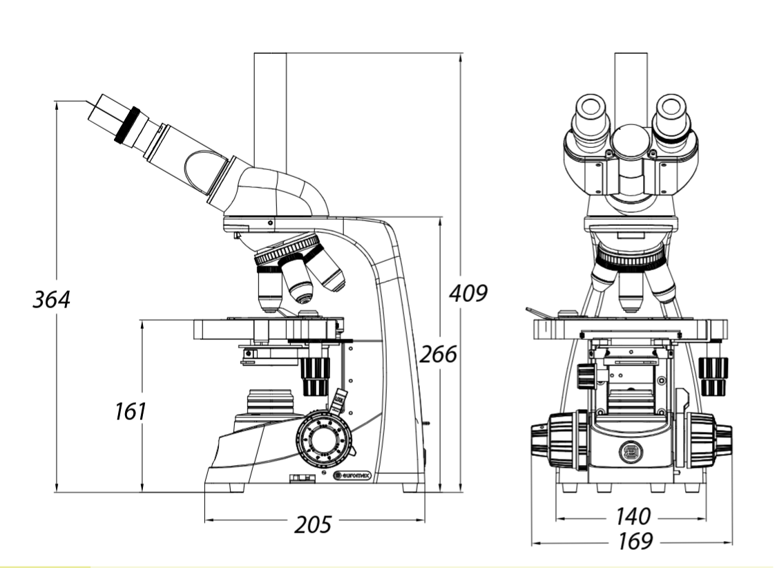 Minden fej 360°-ban forgatható. A trinokuláris fej fix fényosztóval (50:50) rendelkezik.